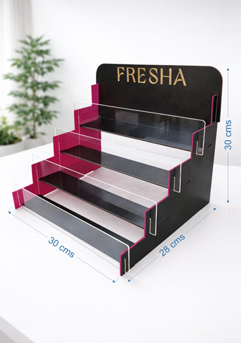 EXHIBIDOR de 4 peldaños en MDF de 3 mm y ACRÍLICO de 2 mm